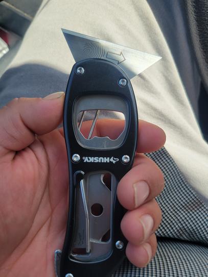 In a nutshell, the Husky sliding utility knife has all-metal construction, a full-size bottle opener, thumb control retraction mechanism, tool-free blade change, and quick-change dual-blade design.